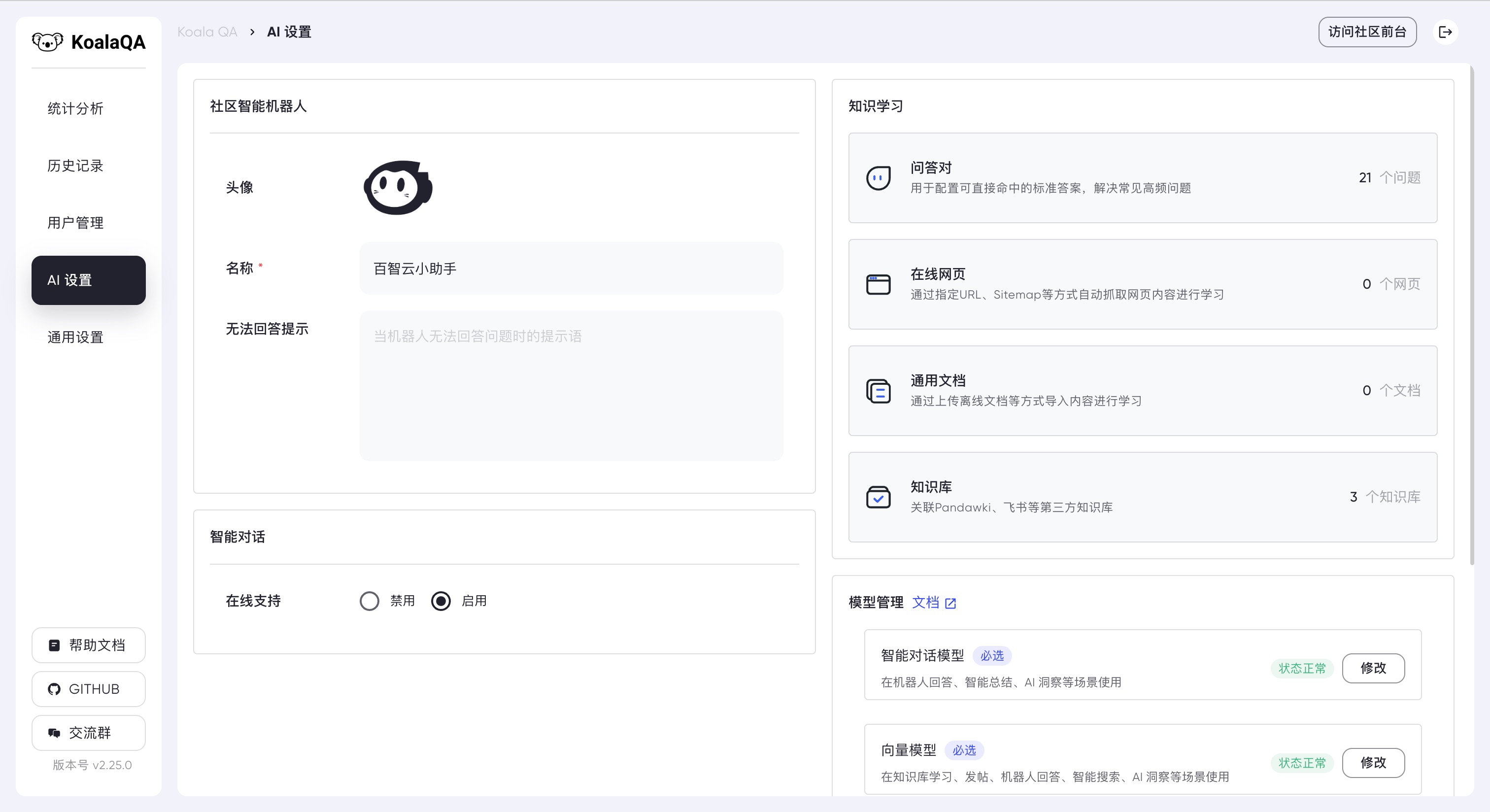KoalaQA 需接入智能对话、向量和重排序三大必选模型(推荐 deepseek-chat、bge-m3、bge-reranker-v2-m3),可选文档/图像分析模型增强功能。支持百智云、DeepSeek、OpenAI 等平台 API,配置简单,新手推荐使用百智云在线模型。